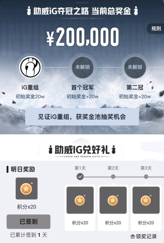 活动分为三步:重组积累20W奖金,要是iG后续能拿下第一冠和第二冠,均能累加20W奖金。而玩家则需要通过每天的签到获得参与资格,签到天数越多,抽奖机率更大,瓜分金额越多。